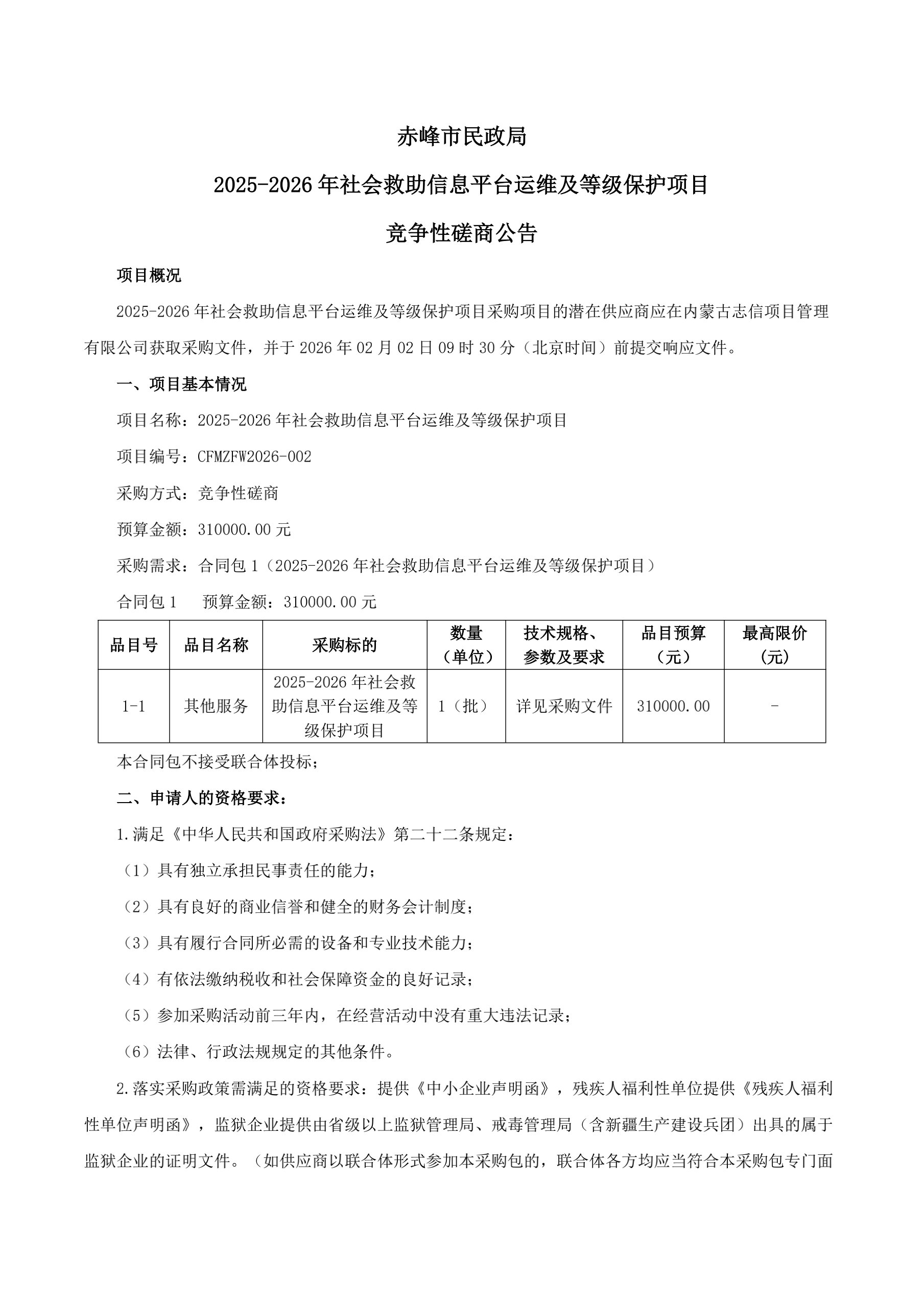 赤峰市民政局 2025-2026 年社会救助信息平台运维及等级保护项目 竞争性磋商公告